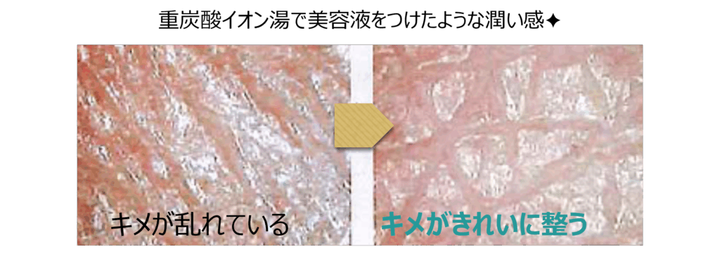 細かい泡が肌の表面に付着し、皮膚から重炭酸イオンが吸収されると血管拡張、血流改善。その結果、末梢神経、毛細血管が刺激され皮膚疾患の改善や肌引き締め効果