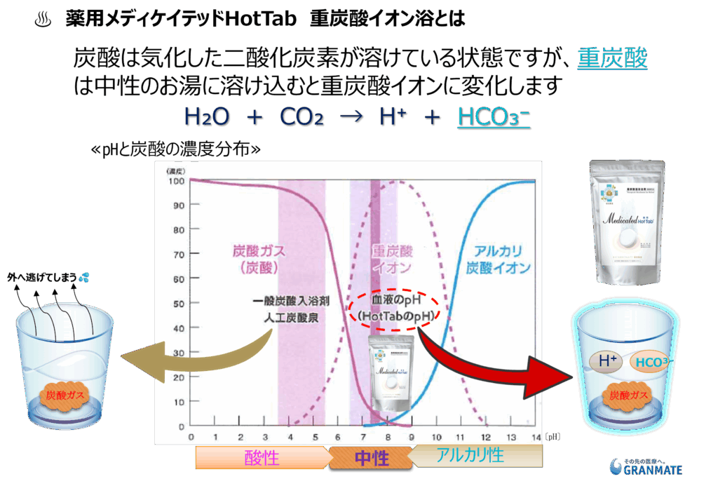 重炭酸イオンはお湯の中では皮膚から吸収されやすく体は酸素を吸収しようと血管を膨張させ、血流を良くしようと働く〔動脈硬化、心臓病、循環器系疾患、糖尿病、神経痛、リウマチ、冷え性、高血圧、肩こり、下肢静脈閉鎖症などの緩和〕