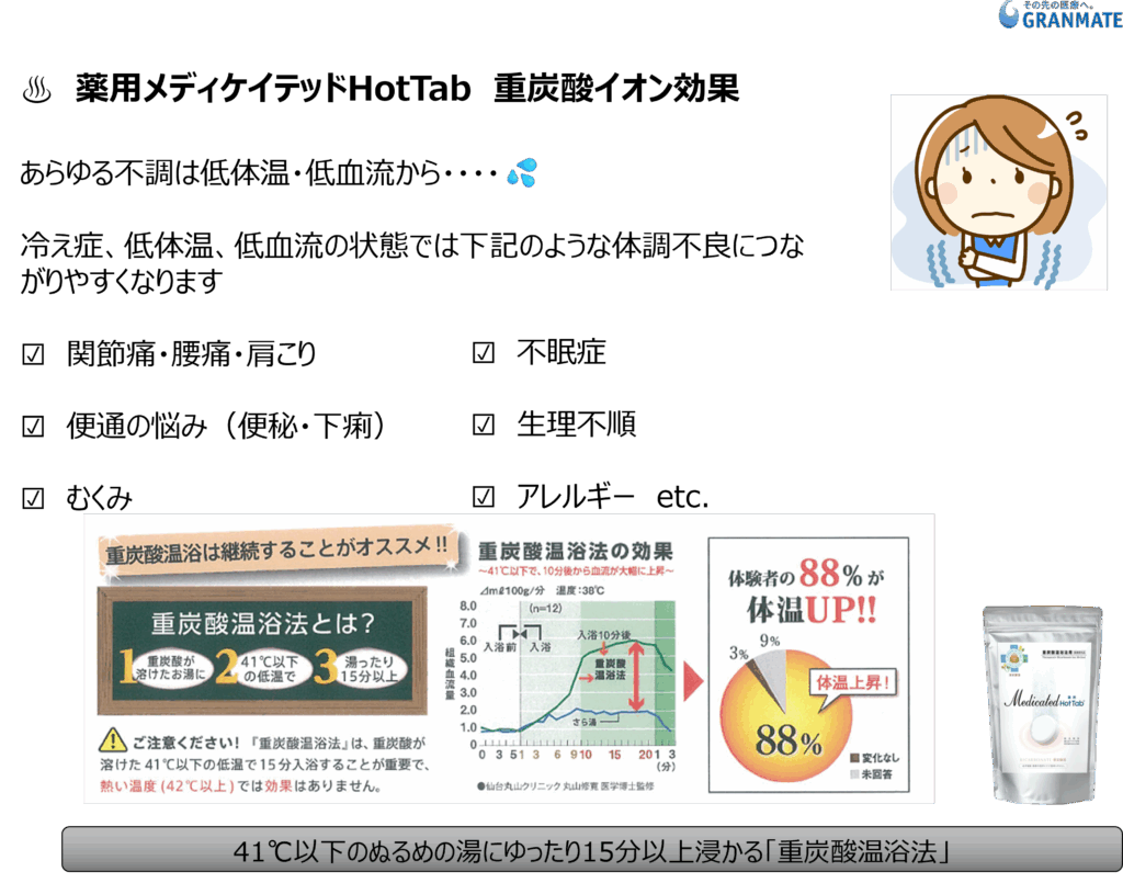 薬用メディケイテッドホットタブでの重炭酸浴が具体的にどんなサポートをしてくれるかをご紹介します。