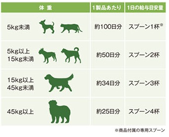 【体重5kg以下:付属スプーン1杯、体重5~15kg:スプーン2杯、体重15kg以上:スプーン4杯】